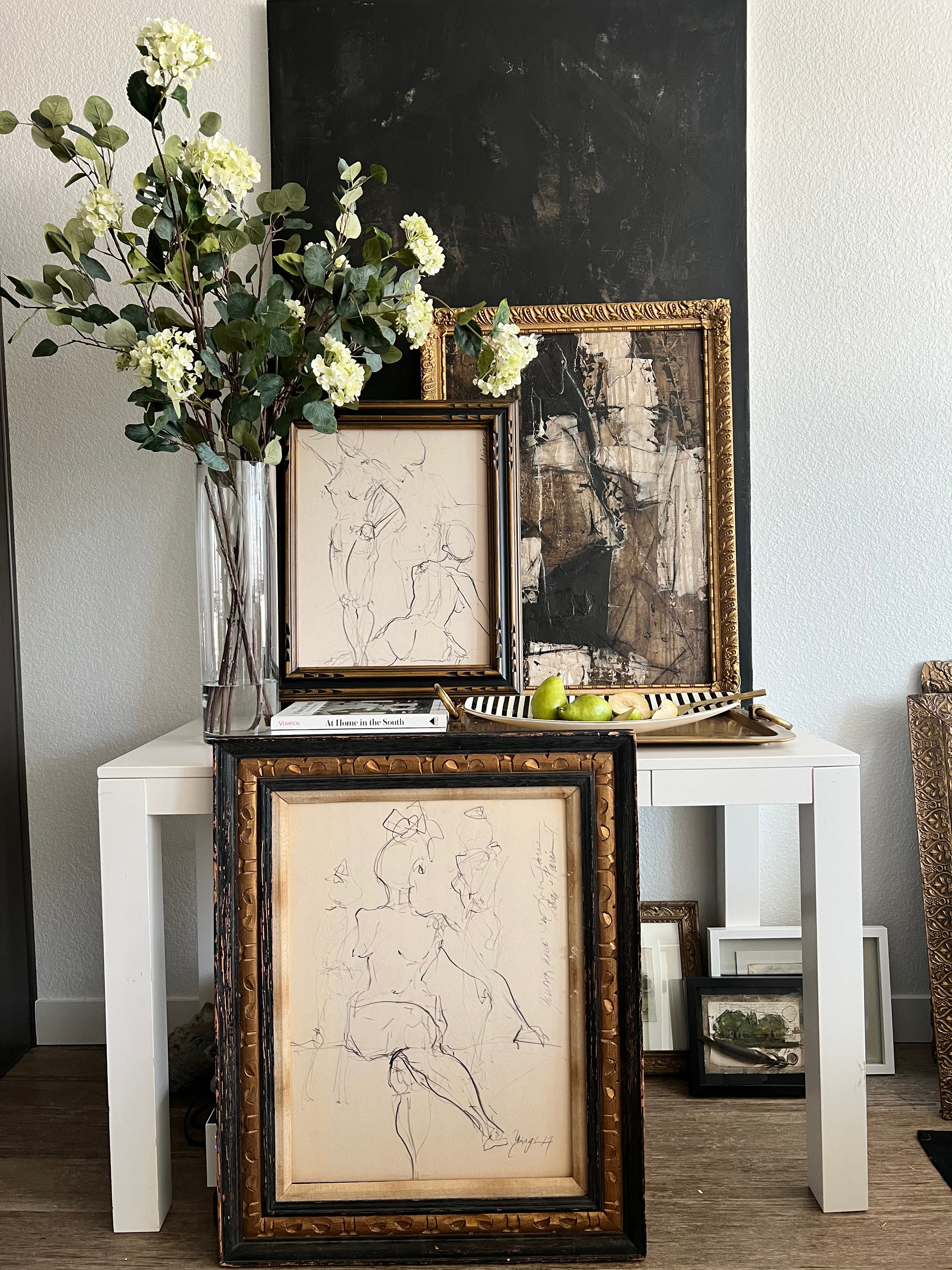 This collection of original works includes beautiful pencil and charcoal nudes and striking textural abstracts. Most pieces come framed in collected vintage and antique frames Gigi sources during her frequent trips to Paris.